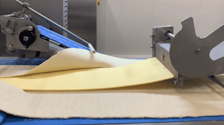 Blocs de pâte feuilletée sont produits sur cette ligne autonome. Sa conception compacte lui confère une grande flexibilité pour la production de blocs de pâte pour pâte feuilletée, viennoiserie, croissants, palmiers, etc.